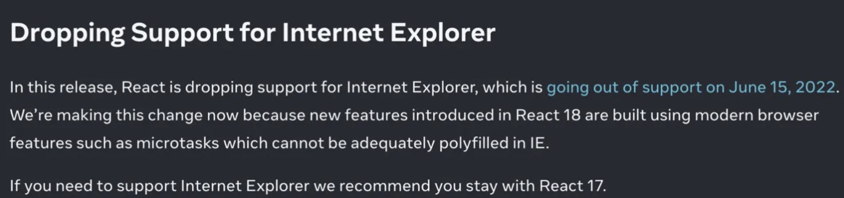 React18 建立在现代浏览器功能之上,并引入了在 IE 中无法通过捆绑全局 polyfill 解决的功能。因此升级到 React18 以上版本将不再支持 IE。