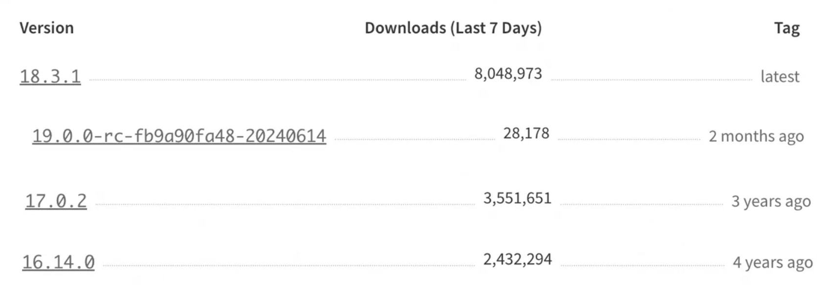 如果您最近打算升级项目的 React 版本,可以参考文章中的收益和代价综合考量。这里建议将项目的 React 版本升级到 18.3.1(使用人数最多,且收益最大化)。